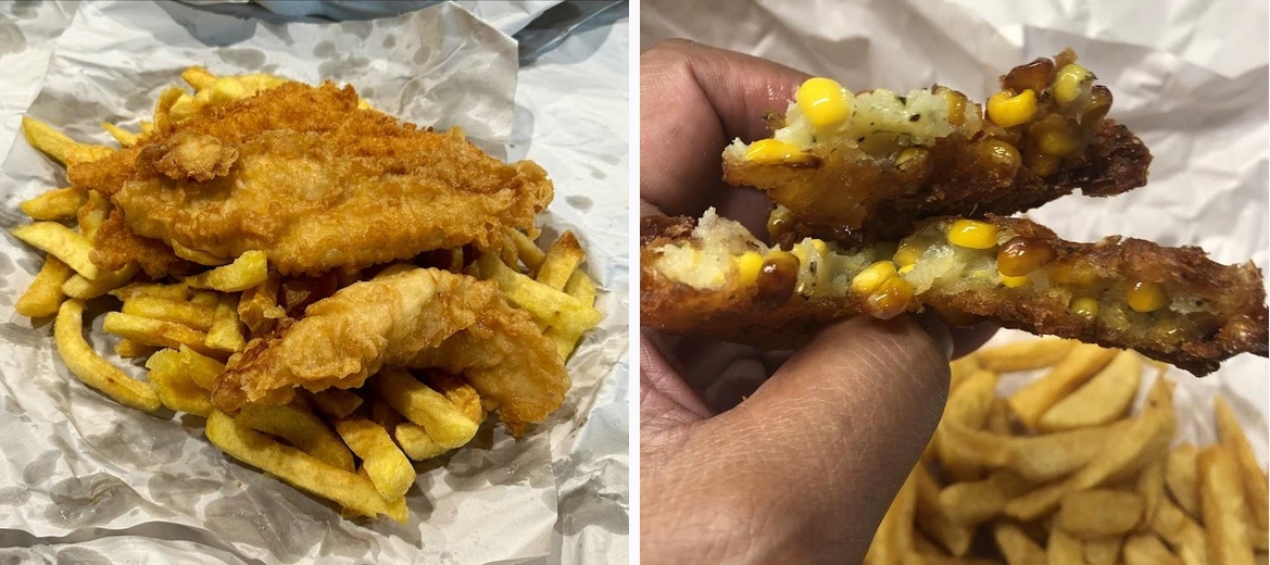 Fish was delicious and you could tell it was fresh. Loved the homemade chips, they were a bit dry but that was probably because I was late to pick them up. Parking is scarce, so you might have to park down the road on a busy Friday/Saturday night. Also the potato fritter was a literal 10/10, probably the best I’ve ever had.